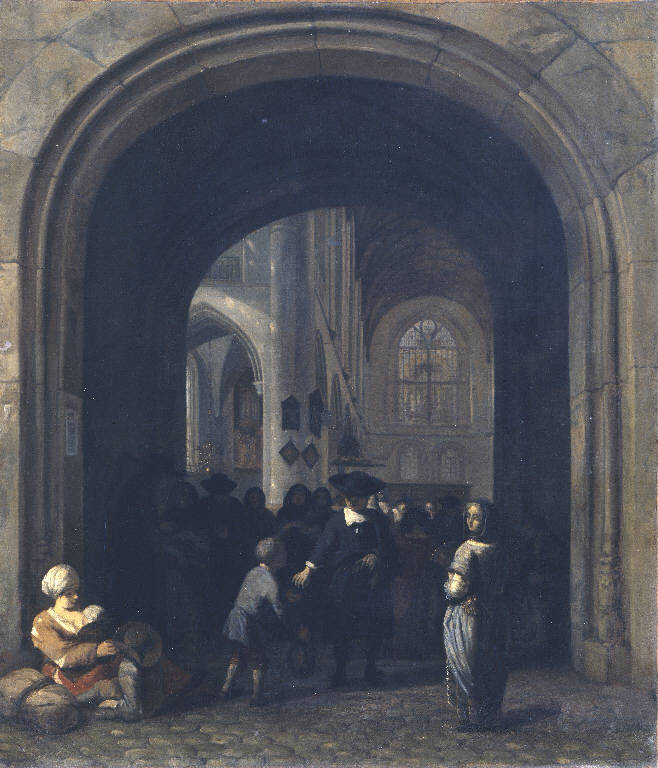 - NOTIZIE STORICO CRITICHE Oggetti collegati: Festa popolare. Probabile significato moralistico, nel confronto con il pendant. Firmato. All'interno della chiesa, appesi al pilastro, Rossi fa notare le tavole con emblemi araldici da rapportarsi alle sepolture nelle vicinanze, si tratta di un motivo che ricorre spesso nelle rappresentazioni di edifici chiesastici olandesi. La rappresentazione risente degli influssi del fratello più giovane dell'artista Gerrit Adriaensz.