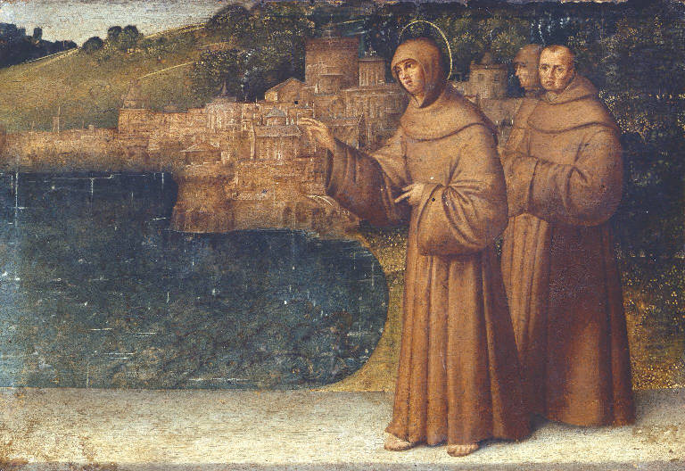 - NOTIZIE STORICO CRITICHE Si tratta probabilmente di un frammento (la tavola deve essere stata decurtata di circa 20 cm in larghezza) del pannello laterale destro della predella del polittico della Chiesa dei Francescani Riformati di Imola. Oggetti collegati: Miracolo dell'asino che si inginocchia davanti al SS. Sacramento (Berlino, Staatliche Museen), Miracolo di S. Antonio che fa parlare un neonato per discolpare la madre (Berlino, Staatliche Museen), Vergine che adora il Bambino con i Santi Francesco d'Assisi, Antonio da Padova (?) e Bernardino da Siena (Zaganelli Francesco e Bernardino, Dublin, National Gallery of Ireland), Cristo morto sorretto da due angeli (Roma, Villa Albani, Collezione Torlonia). La data certa 1509 è riferita sulla base della pala conservata a Dublino. La cornice risale al secolo XX ed è in listello ligneo (liscio) dorato. La scritta sul cartellino è poco leggibile.