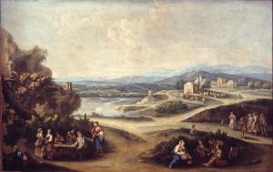 - NOTIZIE STORICO CRITICHE Opera pervenuta in Accademia Carrara con legato Francesco Galliccioli del 1906. Fa parte di una serie di paesaggi siglati eseguiti probabilmente negli ultimi anni del XVIII secolo. Oggetti collegati: "Paesaggio con viandanti, frati e borgo con cascinale" (num. inv. 58AC00775); "Paesaggio con stagno e contadini" (num. inv. 58AC00776); "Paesaggio fluviale con fiera contadina" (num. inv. 58AC00777).