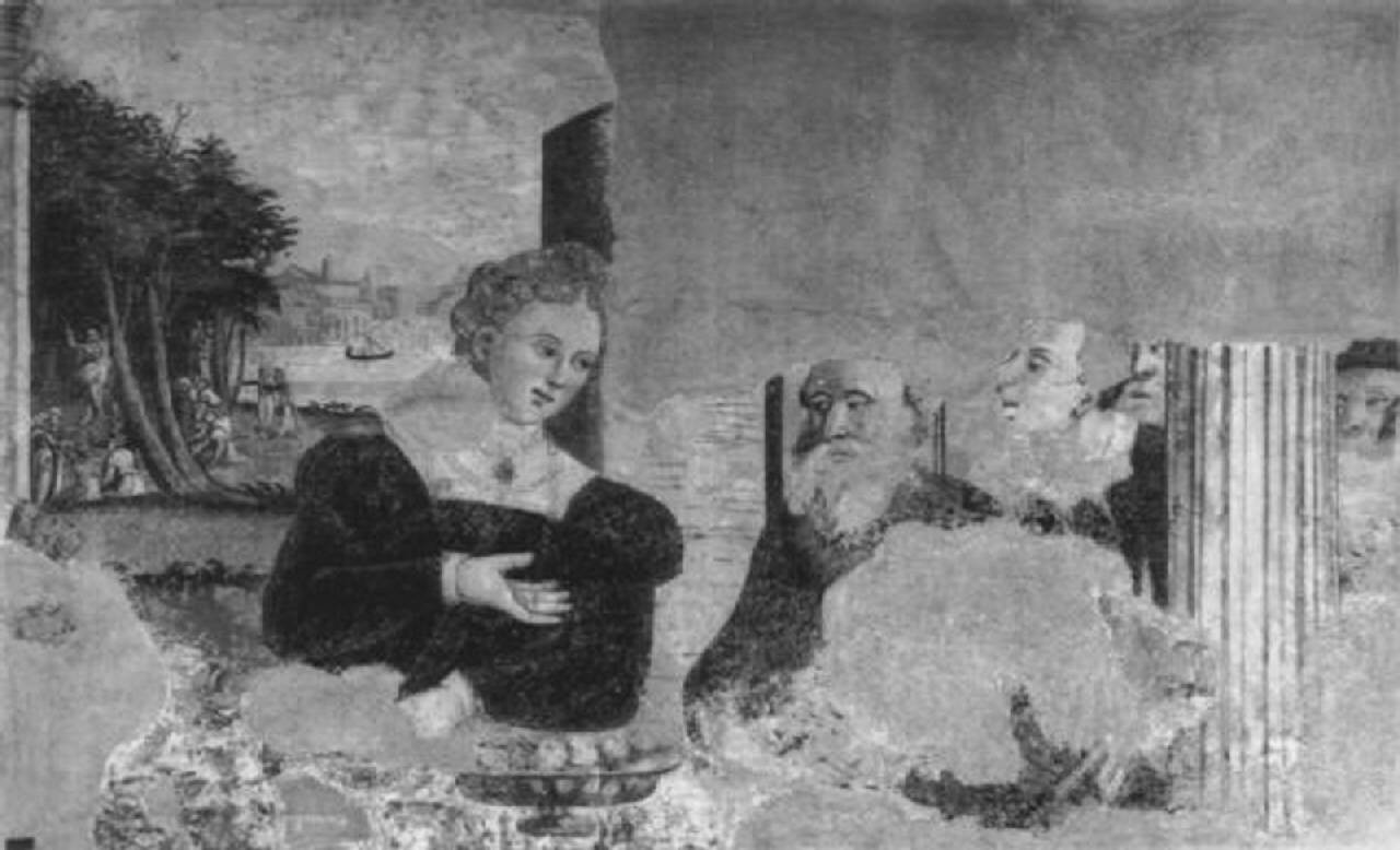 - NOTIZIE STORICO CRITICHE Insieme a una "Madonna con Bambino in trono", una "Madonna con Bambino", un "Santo vescovo e Santa", un "San Giovanni Battista", il dipinto proviene dal Convento di San Francesco, ora Scuola Elementare Ghisleni. Strappato dalla sede originaria nel 1938, è stato lasciato nell'aula docenti della scuola sino al 1994 per poi essere depositato nella Sala dei Giuristi nel Palazzo del Podestà di Bergamo.\nUn parallelismo con un affresco del "Battesimo di Cristo" risulta indicativo per la collocazione originaria (abside rettangolare della chiesa), la destinazione (una cappella dedicata al Battista) e il soggetto, in cui sono riconoscibili nella piccola scena sul fondo la "Predica del Battista" e nella donna in primo piano Salomé. Dovrebbe essere un'opera giovanile, probabilmente eseguita nel corso del quarto decennio del Cinquecento, di Gerolamo Colleoni.\nInventario Generale Comune n. 138702.