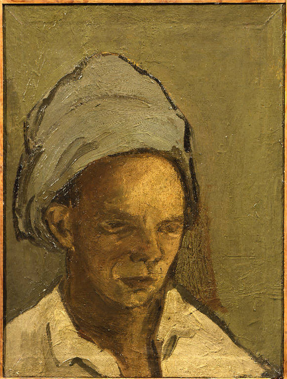 - NOTIZIE STORICO CRITICHE Allieva di Achille Funi. Si diploma all'Accademia Carrara nel 1952. Sposata con lo scultore Alberto Meli, dopo un'esperienza di vita in svizzera, ritorna a vivere in Italia, a Luzzana. Sono numerose le sue esperienze artistiche con importanti esponenti dell'arte contemporanea come Aloi, Brignoli, Calizzi, Rossi, Richter, Arp, Beninger, Fisher, Probst e Max Bill. Una sessantina di sue opere sono attualmente conservate ed esposte presso il Museo d'Arte Contemporanea-Donazione Meli di Luzzana. Solo l'ultima fase dell'attività artistica della Gaini è astratta: la sua lunga carriera è segnata da una produzione figurativa, che ha inizio appunto con gli insegnamenti di Brignoli, Galizzi e Funi. L'opera qui schedata è di un certo interesse non solo per la matericità esecutiva, ma anche per quel segno nero deputato a definire i contorni, la cromia verde dell'incarnato e i tratti del volto leggermente deformati che senza alcun eccesso parlano di qualche frequentazione espressionista nella formazione della pittrice.