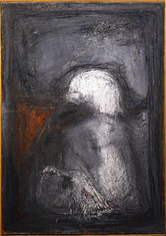 - NOTIZIE STORICO CRITICHE Si diploma presso l'Accademia Carrara nel 1989, dopo aver vinto i premi Brolis, Oprandi e Pandini. Oggi utilizza non solo la pittura, ma anche la fotografia, come mezzo espressivo. Esiste una notevole distanza cronologica tra quest'opera, realizzata nel 1985 e l'ultima conservata in Carrara del 1978. La distanza è soprattutto concettuale: il pittore non si esprime più secondo un linguaggio codificato di forme, intese insenso figurativo, e colori, intesi come campiture atte a dare sostanza al reale, ma questa esercitazione accademica, di un percorso scolastico ancora in fieri, è completamente astratta e realizzata con una molteplicità di mezzi, quali la matita, il carboncino e l'olio. Una composizione fatta di luci e ombre, senza forme, solo bagliori che si proiettano nel buio, in cui l'unica macchia di colore, quella sorta di triangolo rosso a sinistra, sembra caricare di tensione l'opera.