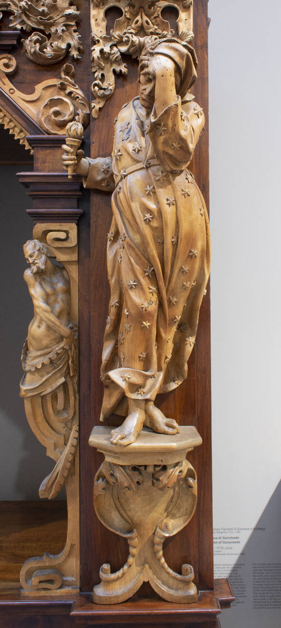 - NOTIZIE STORICO CRITICHE L'alcova fu commissionata alla famiglia Fantoni da Gerolamo Sottocasa fra il 1774 e il 1775 per celebrare due eventi: il conferimento ai Sottocasa del titolo comitale e il matrimonio di Gerolamo con Elisabetta Lupi. La bottega era allora guidata da Grazioso il Giovane che poteva contare sulla collaborazione del figlio Donato Andrea, di cui Gerolamo Sottocasa proprio in quegli anni era protettore e mecenate. A suggerire alla bottega l'apparato iconografico fu lo stesso Gerolamo che, come socio dell'Accademia degli Eccitati di Bergamo, aveva composto molte poesie con diversi riferimenti alla mitologia classica interpretata secondo lo spirito arcadico. Le immagini figurate dell'alcova dovevano illustrare il matrimonio e i valori di moralità su cui doveva fondarsi la famiglia.\nDi grandi dimensioni, l'alcova presenta una struttura rettangolare in legno scuro (noce) con un apparato decorativo e scultoreo suddiviso in tre ordini di scene in legno chiaro di tiglio. Nell'ordine inferiore, affiancati da angioletti con festoni, si trovano i bassorilievi raffiguranti Apollo (che col suono della viola vince la gara col satiro Marsia che suona la rustica siringa di Pan) ed Ercole (che dichiara il suo amore a Onfale, regina di Lidia). In quello superiore, tra dei telamoni, si trovano le allegorie della famiglia Sottocasa: in una si vede il committente contemplare un'aquila ad ali spiegate (l'aquila figurava nel nuovo blasone dei Sottocasa), nell'altra un gruppo di contadini dei feudi agricoli dei Sottocasa portare il tributo al conte. Nell'ordine mediano, a corredo delle cornici semipoligonali a guisa delle finestre aperte, si trovano delle sculture raffiguranti l'allegoria della Notte; quella del Lavoro; quella della Poesia e quella della Matematica, Geometria e Architettura. L'apparato figurativo si conclude sopra l'arco dove è illustrato il mito di Ganimede (è raffigurato il momento in cui l'aquila strappa il giovane cacciatore scelto da Giove come coppiere dell'Olimpo).