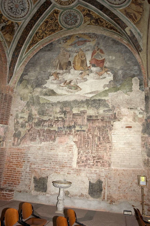 Veduta della città di Pavia ripresa da sud, al centro in primo piano la sinopia dell'imponente S. Antonio abate, titolare della cappella e protettore del Borgo Ticino. Alle sue spalle la città entro la cinta muraria con le alte torri. Il castello ben delineato, ancora intatto con le quattro torri, l'originaria facciata prospettante a ovest, le mura e la Cittadella. Nella porzione tra S. pietro in Ciel d'oro e il Castello si allunga verso Porta S. vito il cosiddetto Salone dei goichi ducali. Dietro il Castello il Bagno della Duchessa Isabella e il Castello di Mirabello e la recinzione del Parco ducale a proseguimento della cinta urbana. Vari armigeri e il drappello di soldati che esce dal ponte levatoio del castello per accorrere in difesa delle mura occidentali abbattute, si riconoscono due vessilli, uno rosso con aquila bicipite imperiale, seguita da uno con croce rossa in campo bianco del Ducato di Milano. Nel cielo nuvoloso campeggiano il Padre Eterno, i tre monumentali Santi patroni di Pavia Teodoro, Siro e Agostino che proteggono la città dall'assedio, accompagnati da un angioletto nudo con iscrizione e al centro un angelo con cartiglio.