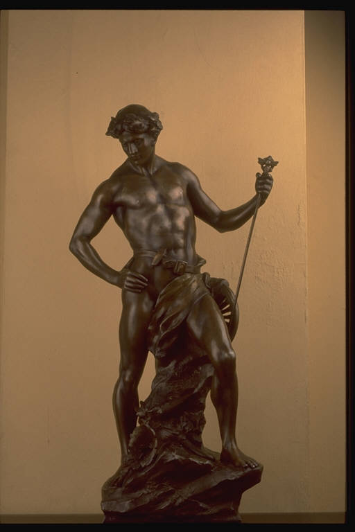 Figura maschile con capo cinto d'alloro, cintura, ruota, cornucopia e asta con ape