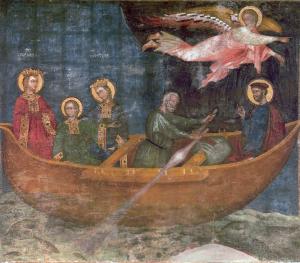 - NOTIZIE STORICO CRITICHE L'affresco fa parte del ciclo di dipinti murali con le storie delle Sante Liberata e Faustina che un tempo decorava l'oratorio di San Giovanni annesso al monastero femminile benedettino di Santa Margherita di Como. Nel 1898, prima della demolizione del complesso, gli affreschi furono staccati e consegnati al Museo Civico. L'episodio raffigurato è quello del viaggio verso Como delle due giovani sante, costrette alla fuga dalla natia Piacenza per poter professare la loro scelta di vita religiosa e sottrarsi al matrimonio voluto per loro dal padre. Nel dipinto è narrato il momento in cui le nobili sorelle Faustina e Liberata, riccamente abbigliate, attraversano in barca il fiume Po in compagnia della giovane Paolina e del loro padre spirituale, il sacerdote Marcello. Un angelo guida il loro viaggio indicando con la mano la direzione da seguire. Questo affresco, così come gli altri appartenenti alla serie, costituisce un'importante testimonianza della pittura lombarda di inizio Trecento e dell'ormai avvenuto abbandono delle astratte consuetudini stilistiche bizantineggianti a favore di un linguaggio pittorico più attento alla resa naturalistica delle figure e dei dettagli, come bene si può osservare sia nella attenta descrizione degli abiti e delle acconciature, sia nel vigore con cui il pittore riesce a trasmettere lo sforzo del rematore.