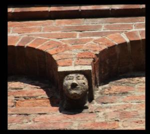 Peduccio a squadra con protome umana raffigurante testa di donna (?) sorridente.