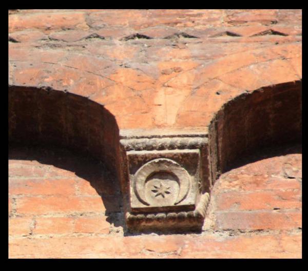 Peduccio a squadra decorato da luna e stella (questa si ripete anche sui lati) e caratterizzato da cornice a tortiglione.