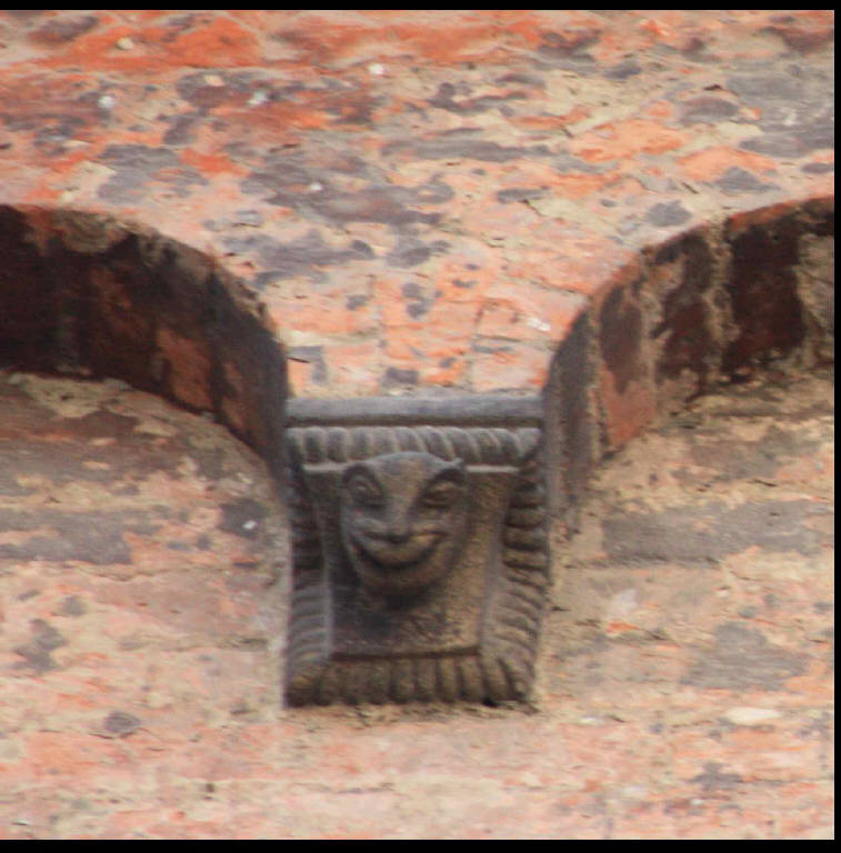 Peduccio a squadra a protome animale con testa di felino (?) ridente; cornice a tortiglione.