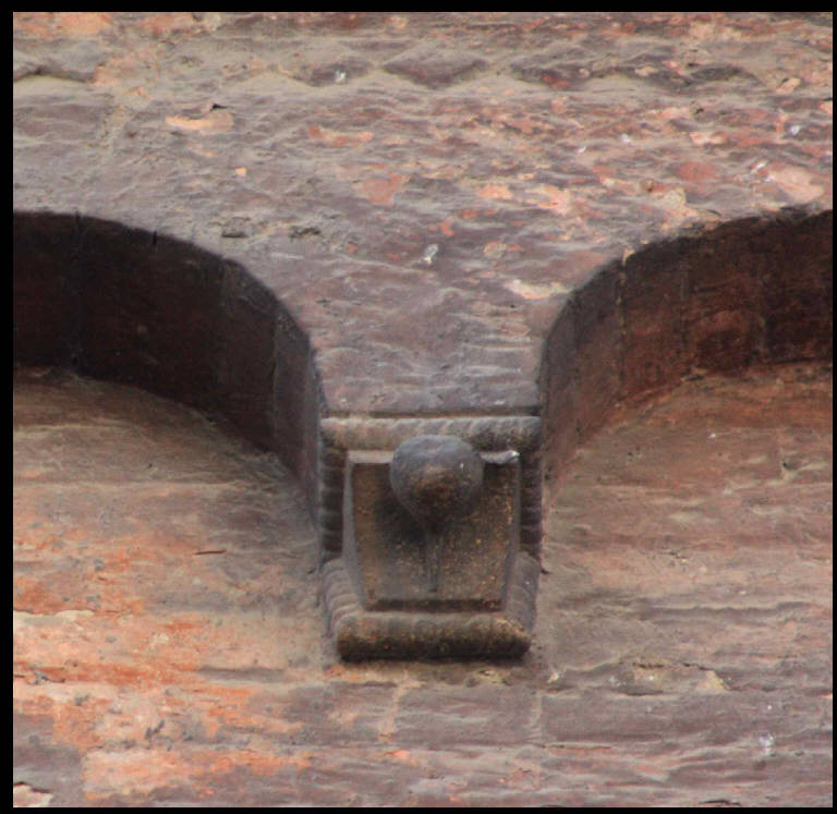 Peduccio a squadra con cuneo liscio a cui si sovrappone ampolla (?) capovolta; cornice a tortiglione.