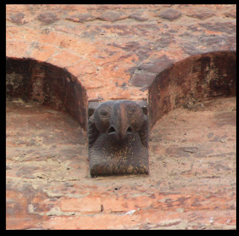 Peduccio a protome animale raffigurante testa di rapace; cornice a tortiglione su tre lati.