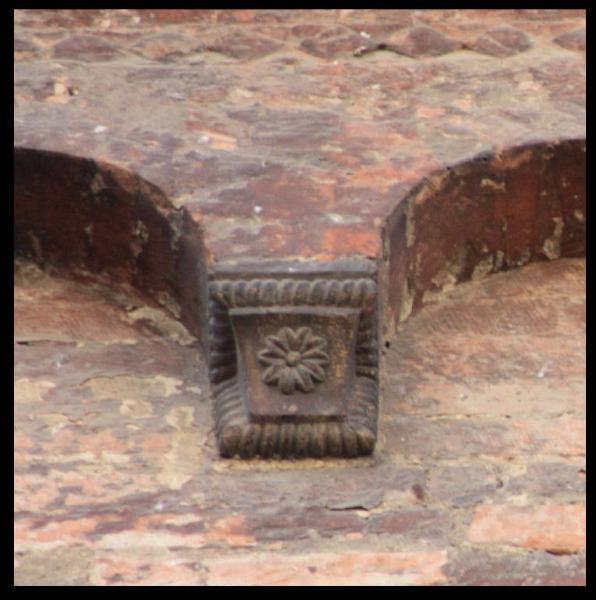 Peduccio a squadra con cuneo liscio caratterizzato da fiore; cornice a tortiglione.