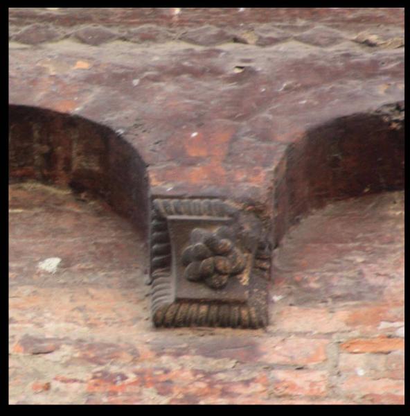 Peduccio a squadra con cuneo a cui si sovrappone elemento floreale a doppia corolla; cornice a tortiglione.