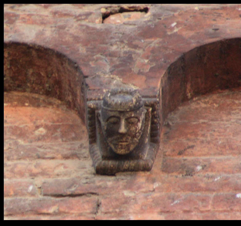 Peduccio a protome umana raffigurante testa d'uomo incoronata; cornice a tortiglione.