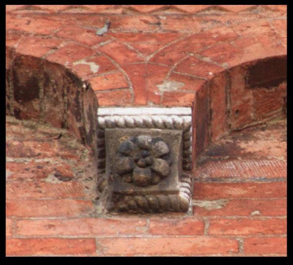 Peduccio a squadra con cuneo liscio a cui si sovrappone un elemento floreale; cornice a tortiglione.
