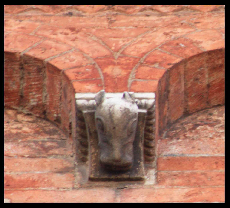 Peduccio a protome animale raffigurante testa di bue; cornice a tortiglione.