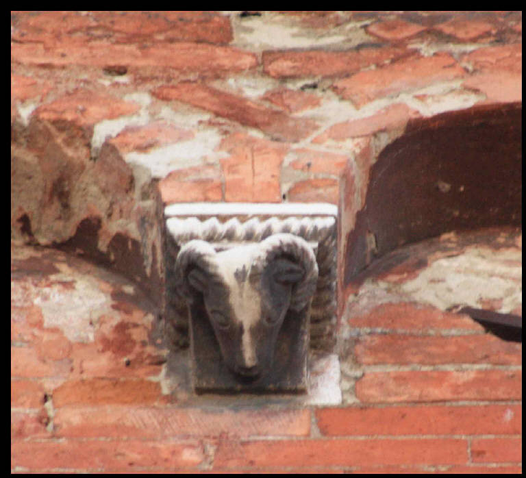 Peduccio a protome animale raffigurante testa di ariete; cornice a tortiglione.