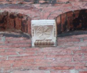 Peduccio a squadra con cuneo liscio caratterizzato da fiore stilizzato a sei petali inscritto in cerchio; cornice a tortiglione.