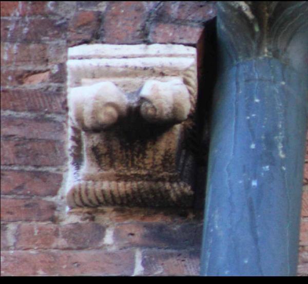 Peduccio a squadra con cuneo liscio caratterizzato da due elementi fitomorfi a ricciolo; cornice a tortiglione.
