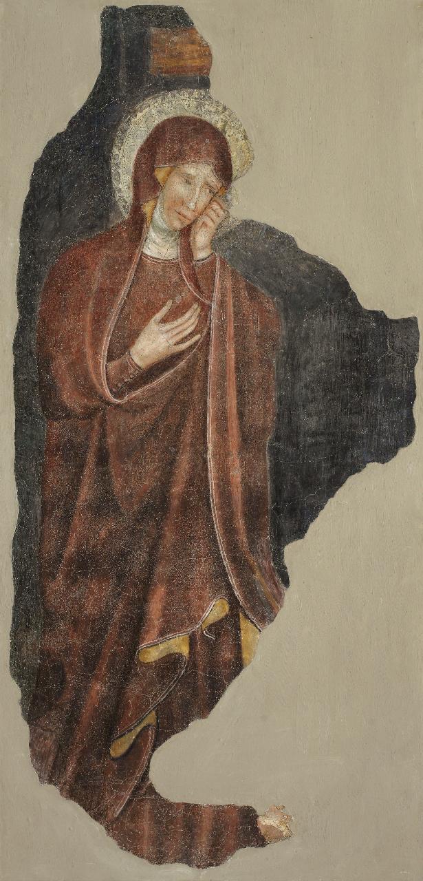 - NOTIZIE STORICO CRITICHE Il frammento di affresco raffigurante la Madonna addolorata faceva parte di una Crocefissione, come dimostra la parte inferiore della croce dipinta accanto alla figura. Insieme ad altri lacerti con la croce e il fondo blu oltremarino, si credeva che la decorazione a fresco appartenesse alla chiesa pavese di Santa Maria di Loreto (Soriga 1930), ipotesi poi messa in dubbio da Donata Vicini (1981) che ha messo in luce la fondazione cinquecentesca del complesso e quindi la discordanza cronologica con il nostro frammento, risalente ai primi decenni del XV secolo. \nIl Bicchi (1961) ha poi avanzato l'idea che l'affresco provenisse dall'ex chiesa dell'Annunciata di Pavia, da cui venne strappato e trasferito su tela da Ottemi Della Rotta in seguito ai bombardamenti del 1945 che disgregarono la scena dipinta. \nDal punto di vista stilistico traspare nella figura esile della Vergine un'influenza da Giovannino de' Grassi ancora forte nei primi decenni del XV secolo nella cultura figurativa pavese, nonché un richiamo al passaggio di Gentile da Fabriano in Lombardia nella resa naturalistica di alcuni dettagli, come i bottoni della manica attorno al polso e le sottili pieghe del soggolo.