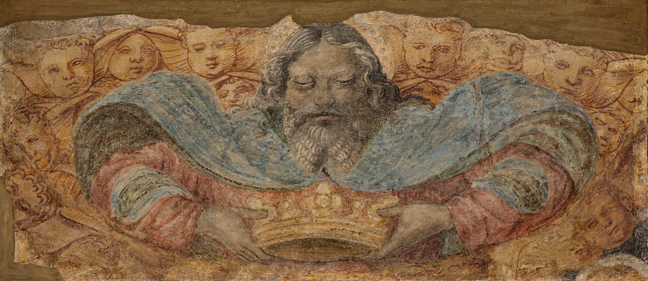- NOTIZIE STORICO CRITICHE Il Padre Eterno tra cherubini apparteneva, insieme agli Angeli musicanti e cantori (inv. P 545) e agli Angeli con strumenti a fiato (inv. P 546), alla decorazione raffigurante l’Assunzione della Vergine affrescata all’interno della chiesa pavese di San Bartolomeo in strada, sede degli olivetani, che venne demolita nel 1844, dopo essere stata inglobata a inizio secolo nel fabbricato di Casa Belloni. I lacerti, tornati alla luce in occasione della demolizione parziale della chiesa nel 1842, furono strappati e trasferiti su tela. Entrarono nella collezione di Giovanni Carlo Francesco Reale e, in seguito, vennero donati alla Civica Scuola di Pittura, dalla quale passarono per permuta nel 1912 ai Musei Civici. \nLa scena dell’Assunzione prevedeva Dio Padre sulla sommità e i gruppi di angeli musicanti, attornianti la figura della Vergine ascendente, che avrebbero dovuto accentuare la verticalità vorticosa della composizione. \nSi possono evidenziare alcuni elementi stilistici, come il dinamismo dei panneggi e il grafismo accentuato nelle linee di contorno e dei tratti che rimanda alla scultura lombarda di fine secolo.\nGià Donata Vicini (1981) aveva ipotizzato la presenza di due mani diverse nella realizzazione degli affreschi, supposizione poi confermata da Laskaris (2011). Nel dettaglio, una mano presenta tratti esecutivi più maturi, quali una precisione più netta nella resa di barba e capigliatura e una maggiore incisività della linea, e avrebbe dipinto sia il Padre Eterno che il frammento P 545. L'altro pittore realizzò invece presumibilmente gli angeli con strumenti a fiato, in cui però viene meno la plasticità. \nPer quanto riguarda la storia attributiva, Crowe e Cavalcaselle (1871) riferiscono gli affreschi ad Agostino da Vaprio e li datano tra gli ultimi anni del XV secolo e i primi del XVI, sulla base di un richiamo alla tradizione foppesca, agli esiti di Bergognone alla Certosa di Pavia, al linguaggio del Montorfano e del milanese Ambrogio Bevilacqua.