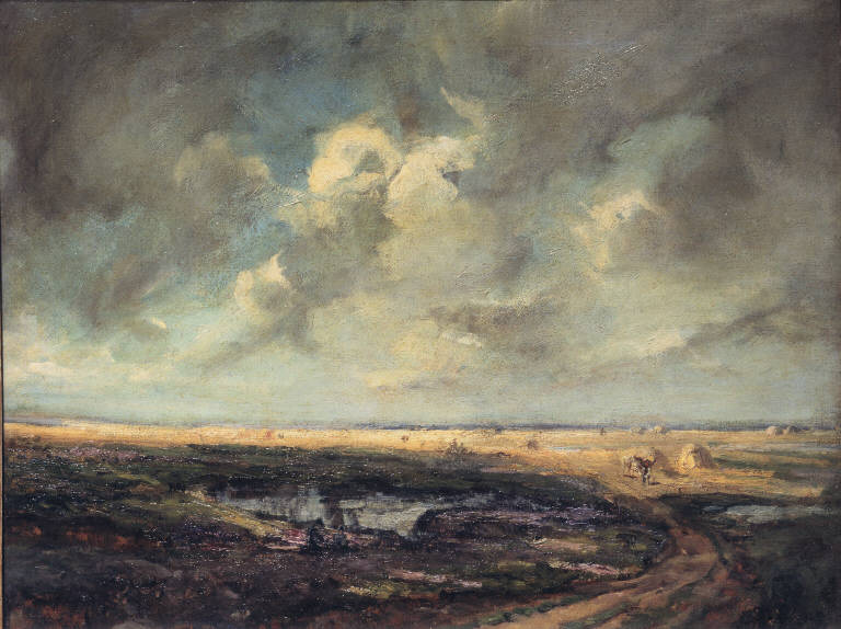 - NOTIZIE STORICO CRITICHE La pittura di Daubigny, condotta en plein air, è caratterizzata da un tocco rapido e leggero, che coglie con immediatezza il trascorrere della luce sugli elementi naturali, con particolare attenzione ai mutevoli cieli della costa settentrionale francese. Protagonista dell'opera è la luce, la cui intensità è determinata dal filtro delle nubi, che si riflette sul paesaggio naturale. \nIl dipinto è corredato da una dichiarazione di autenticità rilasciata a Parigi nel 1950 da un certo Desroussaux.
