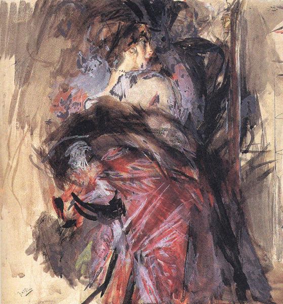 - NOTIZIE STORICO CRITICHE La tempera costituisce un notevole esempio del "movimentismo" di Boldini, maniera personale elaborata dalla metà degli anni settanta e foriera di uno straordinario successo tra la committenza parigina. La donna, elegantemente vestita, è colta in una posa serpentina, come se si stesse civettuosamente rigirando davanti allo specchio. Alle sue spalle, una figura maschile spunta da una porta socchiusa. Le pennellate a sciabolata dell'artista delineano con pochi tratti essenziali e dinamici la scena, in un ambiente che si fonde con le figure. Il non finito diventa valore espressivo, mezzo di comunicazione di una realtà fluida e complessa, ricreabile solo per frammenti e guizzi. La gamma cromatica è scarna ed essenziale, giocata sul contrasto dei bianchi e dei neri.