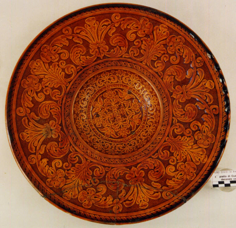 - NOTIZIE STORICO CRITICHE Si tratta di produzione pavese. A lungo si è dibattuto sull'esistenza di una fornace Cuzio, ma ormai è dato per certo che A.M. Cuzio si dilettasse ad eseguire questi straordinari piatti graffiti presso qualche fornace attiva in città. D'altronde sono documentate in città ed in Borgo Ticino numerose fornaci sia laterizie che da maiolica. I piatti 'Cuzio' inoltre rappresentano gli ultimi esiti della grande tradizione della graffita monocroma bruna che a Pavia trova largo sviluppo fino a tutto il XVII secolo. Fasce concentriche con motivi vegetali del repertorio in uso nelle manifatture ceramiche pavesi a fine XVII secolo. Sull'estremità del decoro del bordo compare due volte la data 1691. \nIl bordo di questo esemplare decorato con una bordura graffita a ghirlanda vegetale barocca è del tutto simile a quelle utilizzate su maiolica 'latesina' a rilievo, prodotte dalle fornaci Imbres e Rampini di Pavia.