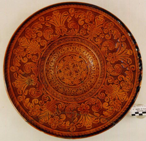 Piatto da 'pompa' in ceramica graffita ingobbiata monocroma bruna con motivo floreale nel cavetto con fascia con iscrizione.