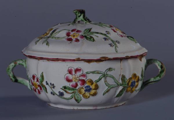 Tazza da brodo tonda leggermente sagomata e costolata con basso piede ad anello, due manici a rametti intrecciati verdi e coperchio leggermente cuspidato con presa a rametto