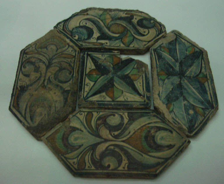 - NOTIZIE STORICO CRITICHE Le piastrelle sembrano provenire dalla Certosa di Pavia. Il Museo della Certosa conserva infatti alcune piastrelle del tutto simili. La loro ubicazione originaria all'interno del santuario non è nota. La tipologia di pavimento in maiolica ad esagonette e quadrelli organizzato in ottagoni intersecati è un motivo di origine spagnola che si diffonde in Italia a partire dal 1442 quando diventa Re di Napoli Alfonso V Duca d'Aragona, che ordina in Spagna le 'rajolettes pintadas de obra de Manises' per impiegarle nei grandi cantieri aragonesi a Napoli. Dopo le prime importazioni, anche le botteghe locali napoletane iniziano a produrre esagonette e quadrelli maiolicati. Da qui la tipologia del pavimento maiolicato si diffonde presto in gran parte d'Italia, soprattutto attraverso alleanze matrimoniali. Può essere questo il caso delle piastrelle della Certosa di Pavia. Nel 1465 Ippolita Sforza sposa Alfonso d'Aragona e nel 1489 Giangaleazzo I Sforza sposa Isabella d'Aragona.\nI raffronti con i pavimenti napoletani sono molto stretti a cominciare con il pavimento della Cappella Caracciolo in San Giovanni a Carbonara a Napoli (1441). Molto significativo il raffronto con il pavimento della Cappella Basso Della Rovere di Santa Maria del Popolo a Roma databile intorno al 1484 per ragioni storiche, di incerta attribuzione a maestranze napoletane o pesaresi.\nEsagonette e quadrelli sono decorati in policromia a 'foglia accartocciata' e 'ad occhio di penna di pavone', motivi ornamentali del repertorio iconografico tardo gotico, chiamato 'gotico floreale'. I colori utilizzati sono azzurro di cobalto, verde ramina, giallo ferraccia, bruno di manganese.