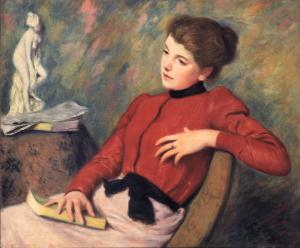 - NOTIZIE STORICO CRITICHE La tela, registrata al n. 2872 dell'archivio Durand-Ruel, è databile intorno al 1895 per consonanze stilistiche in particolare con i due olii datati a quell'anno, La lezione e Conservazione interessante (entrambi in collezione privata, in Piceni 1967, tavv. XXXIII; XXXIV). Il dipinto è tra i più intensi ritratti femminili eseguiti da Federico Zandomeneghi, con riguardo soprattutto alla produzione ad olio che, a confronto con quella a pastello, talvolta risulta eccessivamente rigida e in alcuni casi fredda. La pennellata è libera e sciolta sull'abito, sul drappo che ricopre il tavolino e sullo sfondo, mentre diviene più precisa nell'ovale del volto e nella capigliatura, raccolta in uno chignon. Il giornale ripiegato sul tavolo sembra essere un quotidiano, e insieme alla piccola scultura, indica l'orizzonte culturale a cui la protagonista appartiene.
