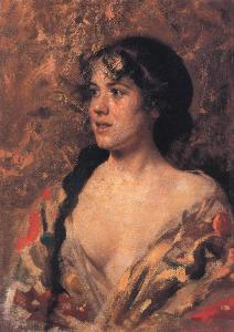 - NOTIZIE STORICO CRITICHE Il dipinto è riconducibile alla piena maturità di Tallone, affermato ritrattista della buona borghesia milanese che, specie a partire dall'ultimo decennio dell'Ottocento, mostra di sapere interpretare in modo personale i modelli derivanti dalla Scapigliatura lombarda. I tratti somatici della giovane sono resi con uno stile accurato, mentre lo sfondo e la veste sono ottenuti con tratti veloci e sommari. Tallone ritrae spesso i propri figli: in questo caso, la protagonista è Teresa, una delle figlie dell'artista, futura moglie del critico d'arte Enrico Somaré. Dal punto di vista stilistico il dipinto è molto simile alla Donna con turbante, di collezione privata, esposta nel 1995 a Bergamo alla mostra "Centenario della fondazione 1895-1925. Pittura a Bergamo da Tallone a Loverini" a cura di Fernando Rea (Centenario della fondazione 1895-1925. Pittura a Bergamo da Tallone a Loverini, Bergamo 1995, p. 225, n. 10). Le due opere presentano, infatti, le stesse scelte cromatiche, la stessa resa a tocchi vigorosi e sommari dello sfondo e del drappeggio della veste.