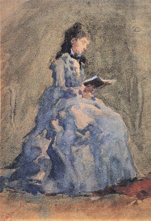 - NOTIZIE STORICO CRITICHE Il piccolo acquerello è verosimilmente uno studio per un'opera di maggiori dimensioni. La Lodola propone una datazione intorno al 1880-1885, epoca in cui i lavori di Leonardo Bazzaro si riconducono in modo più esplicito alla scapigliatura lombarda. Tale ipotesi trova un'ulteriore conferma nella firma che corre in diagonale in basso a sinistra con l'iniziale del nome posta dopo il cognome, una formula molto frequente nei lavori dell'epoca e completamente scomparsa in seguito. L'opera risente fortemente dell'esempio di Tranquillo Cremona e Daniele Ranzoni, protagonisti della Scapigliatura lombarda. Nell'immagine, si combinano brevi tocchi di colore e pennellate più ampie e acquose, che rendono la figura evanescente.