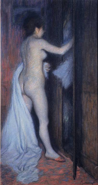 - NOTIZIE STORICO CRITICHE Il pastello, noto come Dopo il bagno, ma il cui titolo originale è La Toilette (così come è indicato nella foto n. 2930 dell'archivio Durand-Ruel), fu esposto alla Biennale veneziana del 1914 (n. 27), in occasione della mostra personale dell'artista, fortemente voluta da Angelo Sommaruga e curata da Vittorio Pica, e poi ancora alla "Mostra commemorativa della Fondazione della Biennale" nel 1935. \nL'opera è realizzata a pastello, una tecnica che Zandomeneghi sperimenta a partire dal 1884, in modo sorprendente: il segno libero annulla qualsiasi descrittivismo per costruire la scena con viva plasticità. L'ambientazione in un interno borghese è caratterizzata dal taglio, che focalizza l'attenzione sulla protagonista, colta nel momento in cui si sta vestendo.\nEnrico Piceni annota la data 1885, che tuttavia non si è potuta reperire dall'osservazione diretta dell'opera. Paola Favretto sposta la datazione, in accordo con la proposta di Mia Cinotti, alla fine del decennio o ai primi anni Novanta, in ragione soprattutto della tecnica adottata. Per affinità di tratto, La toilette è vicina, infatti, a La roussotte, opera datata al 1888 e dovrebbe quindi risalire allo stesso periodo.