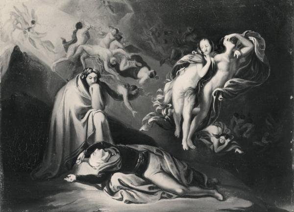 - NOTIZIE STORICO CRITICHE Il dipinto è pervenuto alle raccolte pavesi per legato di Giovanni Carlo Francesco Reale (1892), passato nel 1912 alla Scuola di Pittura (inv. 132) e di qui giunto ai Musei Civici. Il quadro, rubricato negli inventari e nel catalogo manoscritto del Maiocchi come opera del Diotti, è stata, per tema e per ragioni stilistiche, assegnata ad Enrico Scuri. Il bozzetto si collega presumibilmente al dipinto E caddi come corpo morto cade, eseguito dall'artista bergamasco nel 1877.