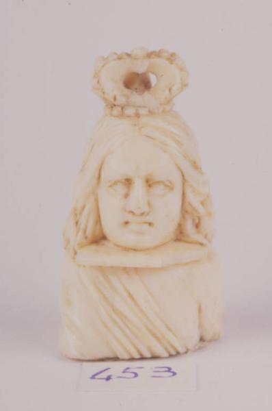 Il busto di re in avorio poggia su di un piedistallo ligneo tornito.