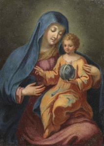 Il dipinto presenta un'iconografia della Vergine col Bambino, abbastanza comune nei dipinti devozionali. La madre, con lo sguardo abbassato, tiene in braccio il figlio, rivolgendolo verso l'osservatore. Quest'ultimo è raffigurato in atto di benedire con la mano destra, mentre con la sinistra tiene il globo.