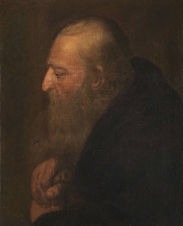 Il ritratto di profilo di uomo anziano dalla lunga barba si può interpretare come rappresentazione di sant'Antonio abate per la presenza del bastone con la campanella tenuto tra le mani, suo attributo tradizionale.\nLa figura dell'eremita ripete fedelmente quella inventata da Tiziano per il quadro della Madonna col Bambino, San Giovannino e Sant'Antonio abate, per la cui datazione la critica oscilla tra il 1503 e il 1530 (Firenze, Galleria degli Uffizi): il nostro pittore non introduce alcuna variante né sotto il profilo iconografico né sotto quello stilistico ed anzi si impegna a riprodurre la maniera morbida nella tessitura delle pennellate e cromaticamente fusa tipica del grande maestro veneto.