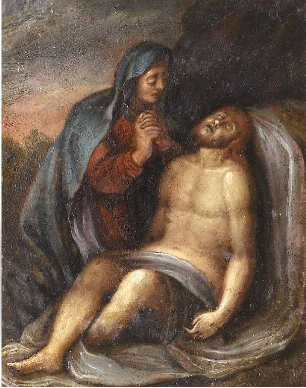 Il dipinto presenta una delle iconografie tradizionali del compianto sul Cristo morto: la Vergine è raffigurata inginocchiata perterra con le mani giunte in contemplazione del cadavere del figlio. Quest'ultimo, anziché essere sdraiato sul suolo, come capita più usualmente, è seduto sul sudario, con la schiena appoggiata a una roccia.