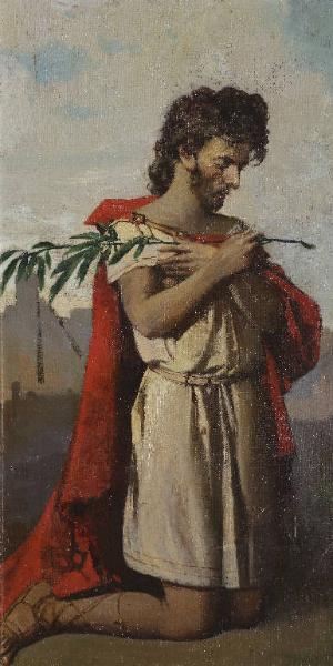 lI martire romano è raffigurato inginocchiato con lo sguardo rivolto verso il basso e le braccia incrociate sul petto, mentre tiene in mano un serto veletale, forse alludente alla palma del martirio.