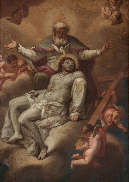 Il piccolo dipinto declina un'iconografia poco diffusa della Trinità, nella quale Dio Padre sostiene sulle ginocchia il corpo senza vita del Cristo, secondo uno schema simile a quello della pietà, mentre lo Spirito Santo sotto forma di colomba è rappresentato al centro tra le due figure. Questo tipo di rappresentazione ebbe particolare fortuna in ambito nordico, forse veicolata anche dall'incisione di Durer del 1511, nella quale Dio Padre indossa la tiara pontificia. Tra gli esempi celebri si possono ricordare la Trinità di Rubens (1614-15), oggi al Koninklijk Museum voor Schone e Kunsten di Anversa, o quella di Ribera al Museo del Prado a Madrid (1635-36 ca.).
