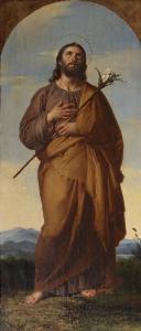 lI santo è raffigurato in età abbastanza giovanile, in piedi a figura intera in un paesaggio, con la verga fiorita nelle mani.