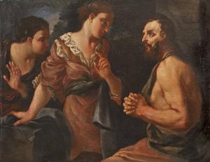 Il dipinto, forse in origine parte di una composizione più ampia, presenta tre figure: una maschile, seduta sulla destra con le mani giunte, e due femminili, una in piedi al centro in atto di indicare con l'indice della mano sinistra verso l'alto e l'altra che compare alle spalle della prima, verso il margine sinistro della tela.\nL'immediata impressione che possa trattarsi della raffigurazione di un episodio biblico non è supportata da nessun elemento che permetta di riconoscere i personaggi raffigurati. Don Pino Strozzi l'aveva intesa come una rappresentazione di Loth con le figlie, tuttavia potrebbe trattarsi anche di Rebecca al pozzo.\nL'uso di una tela dalla trama molto grossa e le sfumature rosse nelle zone in ombra potrebbero suggerire di orientarsi verso l'ambito veneziano di fine '600 o inizio '700 e, più precisamente, verso un pittore vicino alla corrente cosiddetta dei tenebrosi, sull'esempio di Paolo Pagani, nativo della Valsolda, ma formatosi a Venezia.