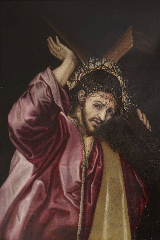 Iconografia tradizionale del Cristo portacroce, di drammaticità trattenuta: il volto di Cristo, la cui fronte cinta dalla corona di spine stilla gocce di sangue, è sofferente e molto emaciato, mentre il corpo - in particolare il braccio alzato a reggere il legno- ha una sua imponenza, sottolineata dal panneggio dell'ampia veste rosata solcata da pieghe spigolose.\nIl dipinto potrebbe essere letto come una versione popolaresca della pittura manieristica del Greco, con riferimenti alla pittura di Giovan Francesco dè Maineri (pittore emiliano attivo tra 1460 e 1535) e di Andrea Solario (la cui produzione è documentata tra il 1480 e il 1524). Si può anche leggervi una certa indulgenza a notazioni patetiche.