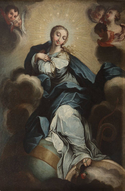 Fu soprattutto dopo la vittoria riportata sui Turchi nel 1571 con la battaglia di Lepanto che la chiesa postriformista caldeggiò la diffusione del culto della Vergine Immacolata e l'adozione in pittura di un'iconografia standardizzata, che trovò negli esemplari di Murillo la più felice e dolce espressione. La figura di Maria, piena di grazia, che fa sporgere il piede dall'ampio panneggio bianco e azzurro per schiacciare la testa del serpente, qui associato alla mela per più chiaramente simboleggiare la tentazione e il peccato che, tranne la Vergine, da allora macchiò l'umanità intera, ricalca molte analoghe composizioni un po' di maniera tramite le quali l'ortodossia cattolità cercò di contrastare l'iconoclastia mariana di origine luterana.\nQuanto al linguaggio stilistico, la pala delle collezioni pavesi, opera di un artista di non speciale qualità, mostra analogie formali e cromatiche con dipinti d'area lombarda della prima metà del Settecento.