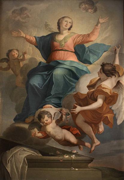 - NOTIZIE STORICO CRITICHE Il grande quadro Strozzi trova un fedele e puntuale riferimento in un'incisione di Carlo Maratti ("L'Assunzione della Vergine", acquaforte) - uguali non solo l'impaginato complessivo, ma anche i particolari fisionomici, i mazzolini di fiori - derivata da un dipinto, forse perduto, dello stesso artista. Si può dunque riferire il quadro della collezione Strozzi all'ambito marattesco.