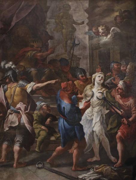 - NOTIZIE STORICO CRITICHE Sebbene condotta con qualche incertezza e mancata finitura nel disegno, la pala ha una sua vivacità narrativa e presa melodrammatica per la presenza di molti tipi fisionomici, di atteggiamenti e posture variate. L'autore, di probabile cultura veneta, fa riferimento a modelli aulici di Tiepolo, rivisti da Sebastiano Ricci e dal primo Francesco Guardi, come ad esempio per la figura dell'armigero dall'elmo piumato o per quella del nano col turbante, seduto sulla gradinata, che richiamano precedenti di scene mitologiche ed episodi di storia classica della cultura veneziana dei primi decenni del Settecento