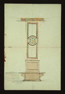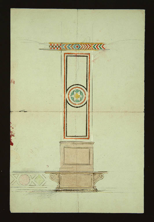 decorazione con motivi geometrici per colonna con fascia decorativa da parete in alto e in basso. Schizzi a matita sul verso