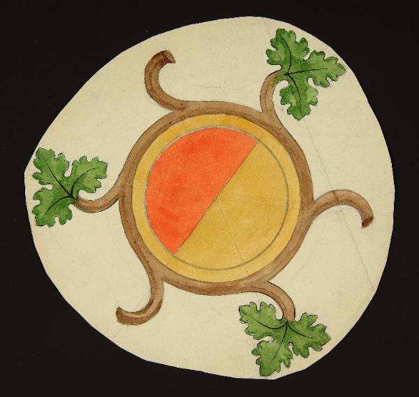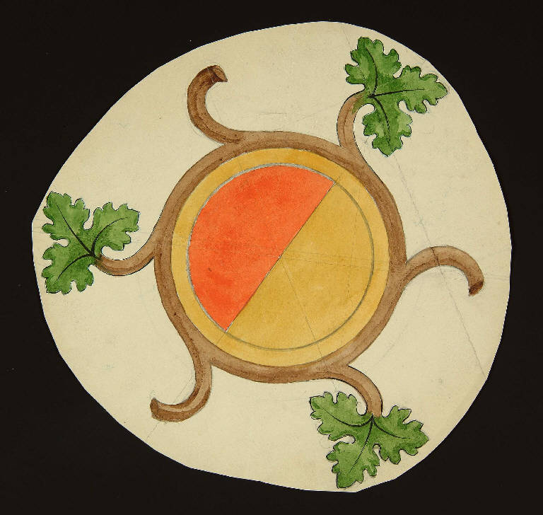 particolare di motivo decorativo tondo bibartito e con motivi vegetali a raggiera